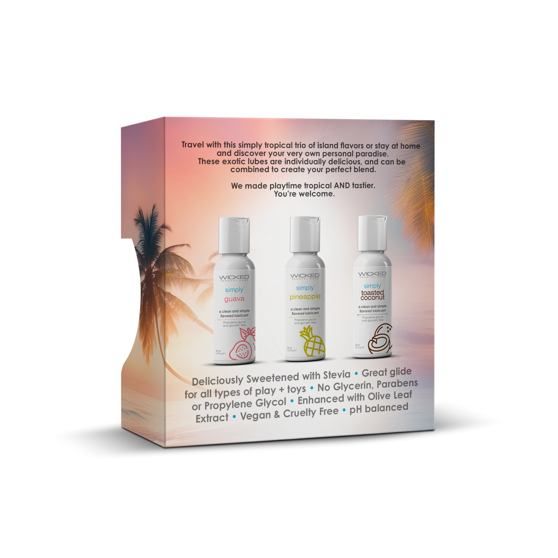 Indulge in a tropical escape with the simply® Tropical Trio from Wicked Sensual Care. This exclusive set features three delectable water-based lubricants in Guava, Pineapple, and Toasted Coconut flavors, all sweetened with Stevia for a delightful taste. These 1 oz travel-sized lubes offer great glide for all types of play and are compatible with toys.